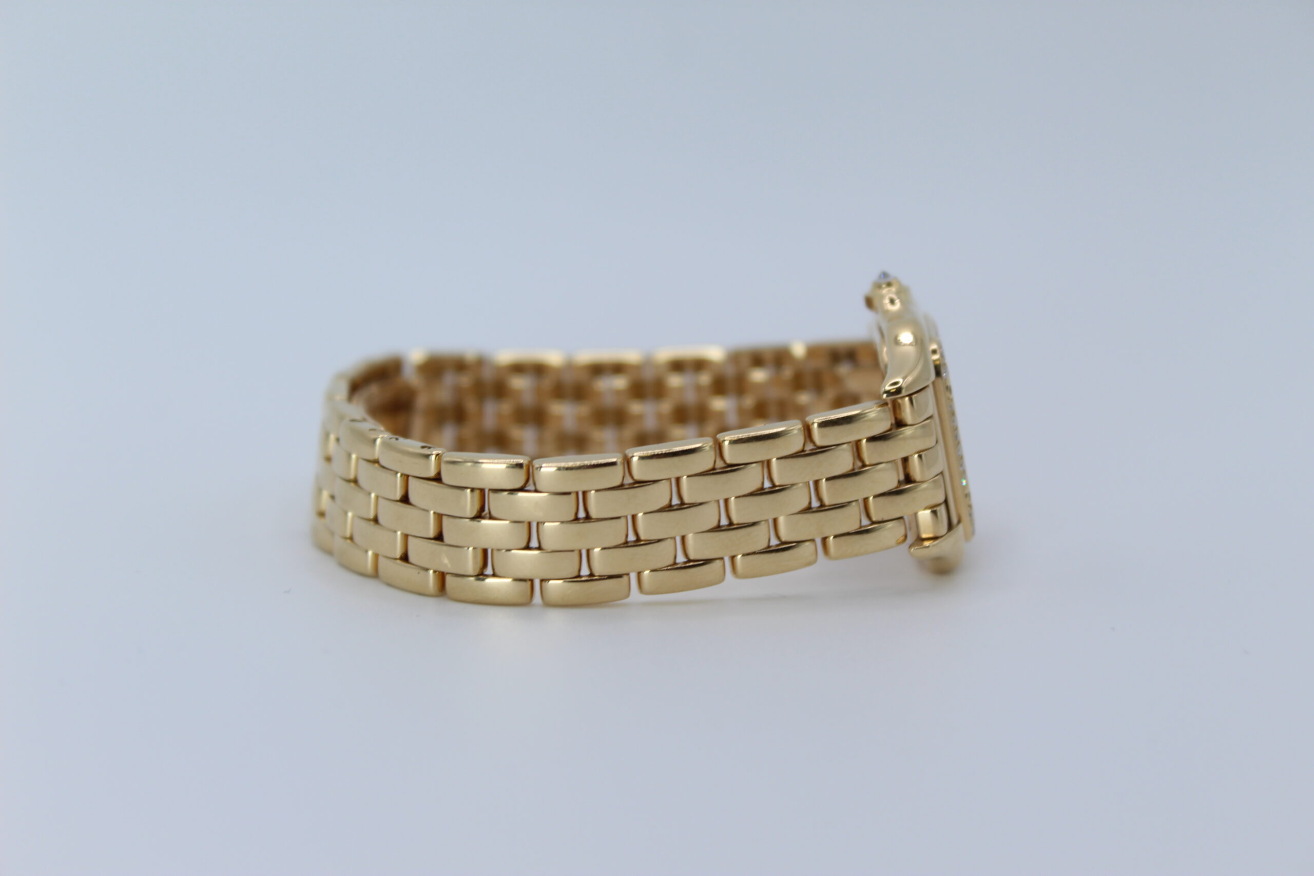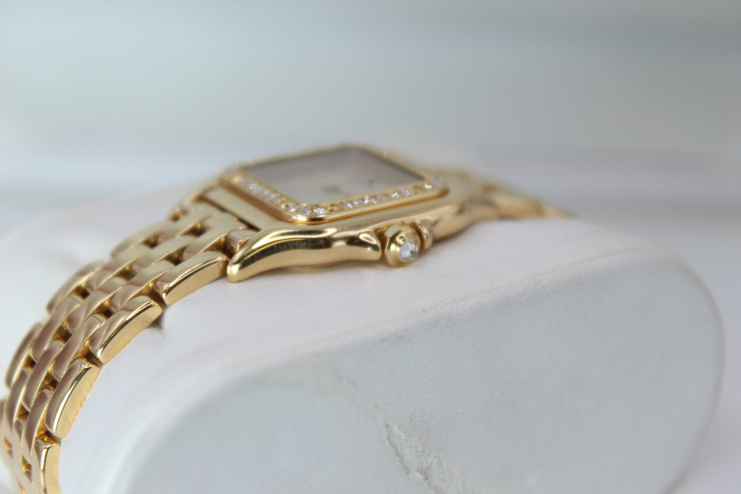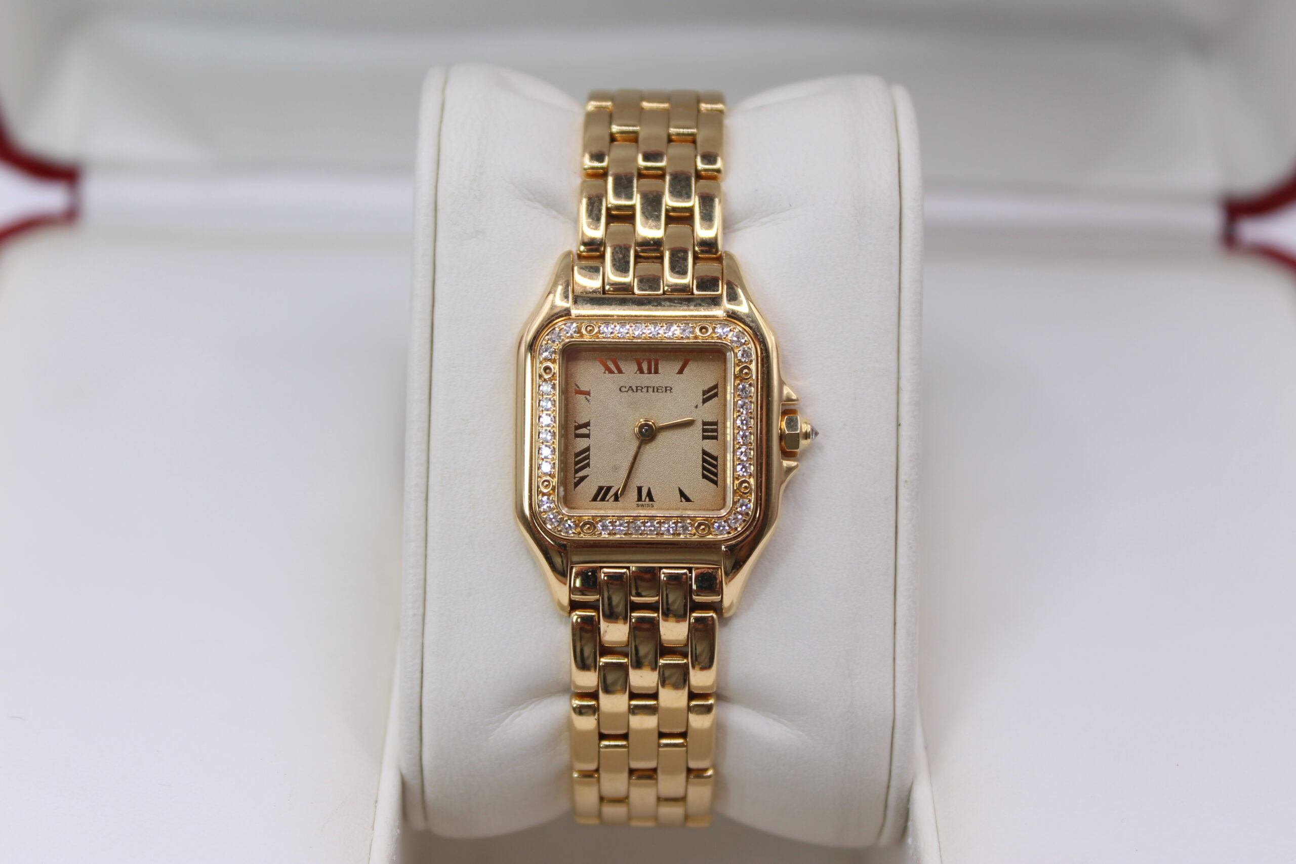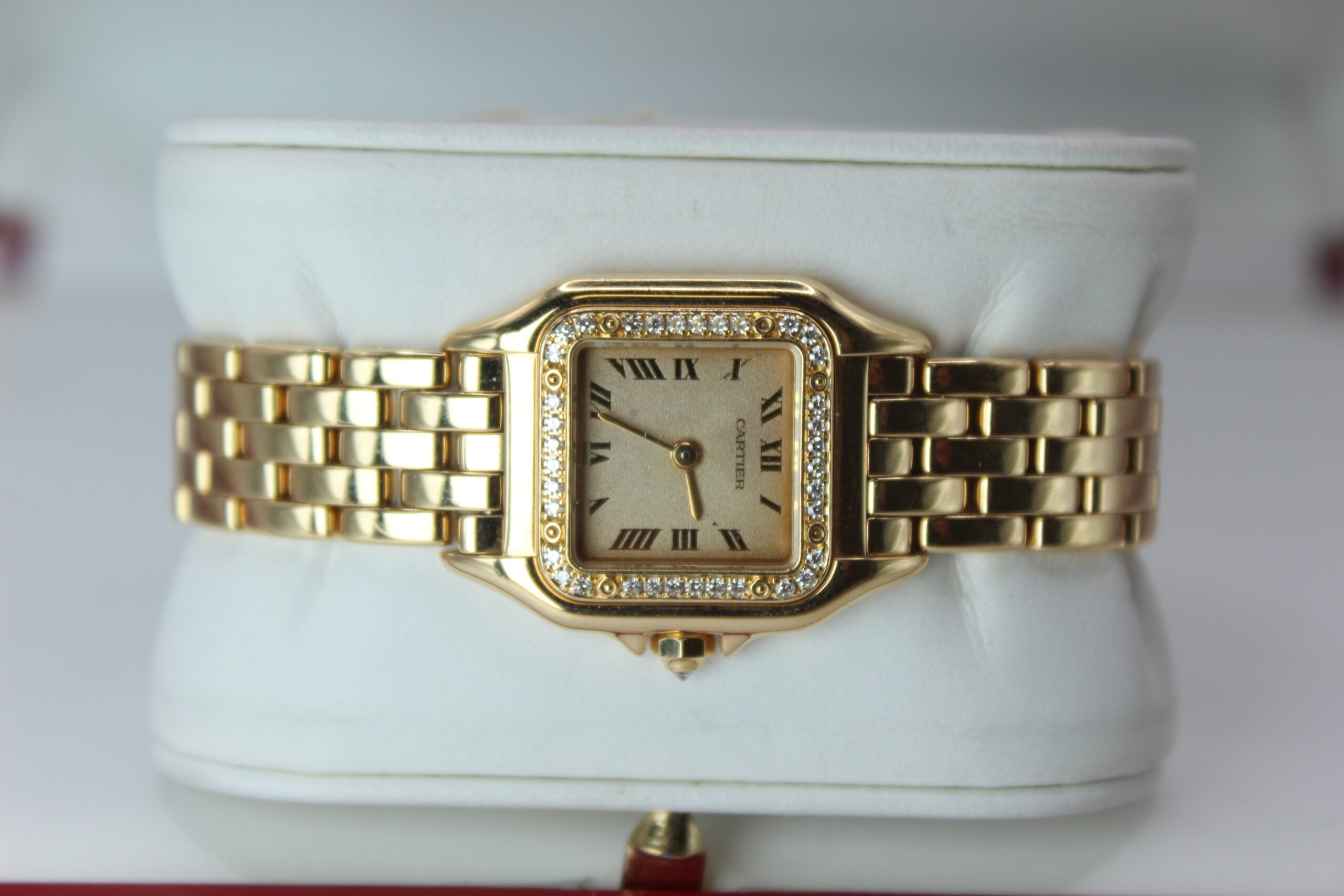 The Cartier Panthère 1280 is a timeless expression of elegance, combining the refinement of fine jewellery with the practicality of a wristwatch. Produced around the year 2000, this model belongs to one of Cartier’s most iconic collections, celebrated for its distinctive square case and fluid bracelet design. The addition of a factory diamond-set bezel elevates the watch, giving it a subtle yet unmistakable brilliance that enhances its luxurious character without overpowering its classic aesthetic.