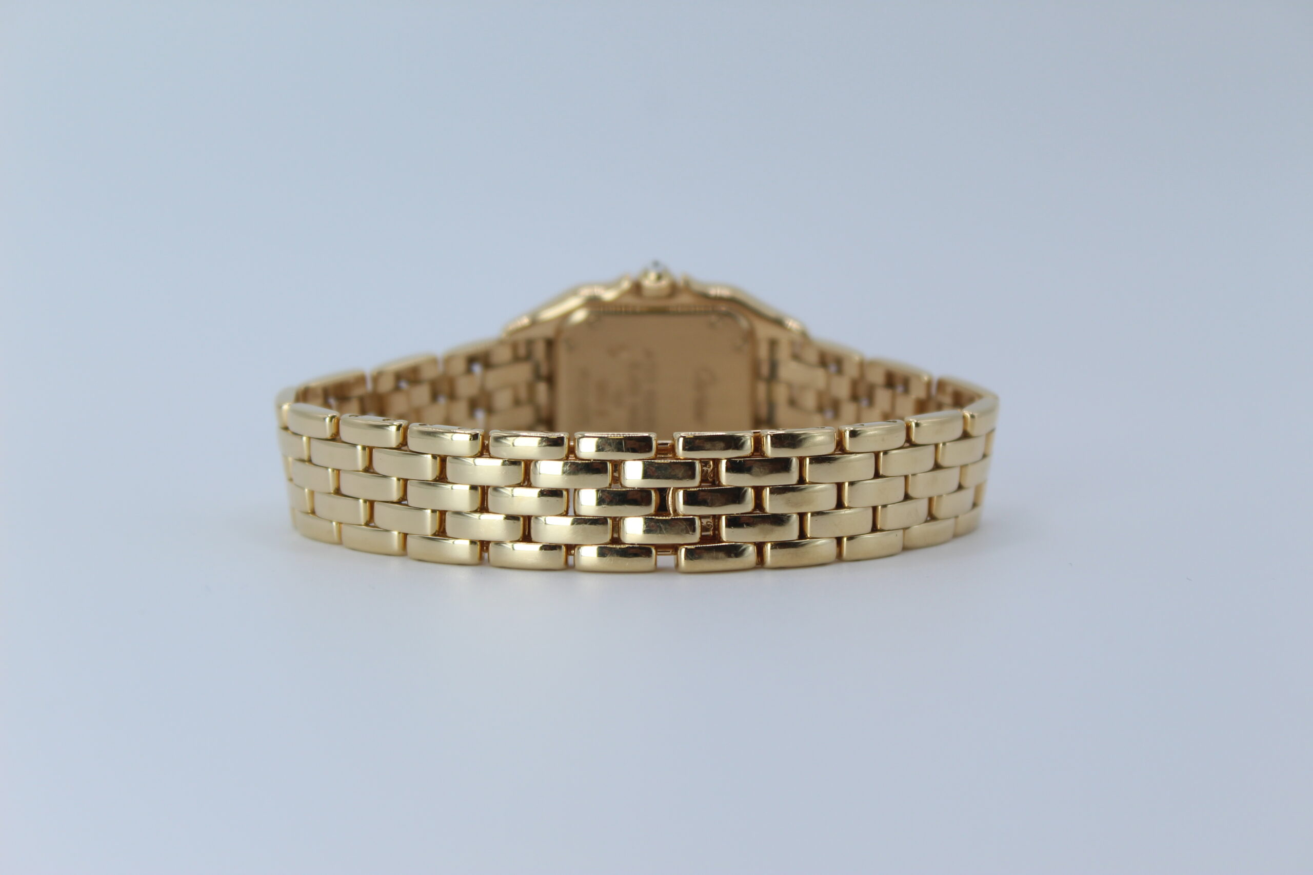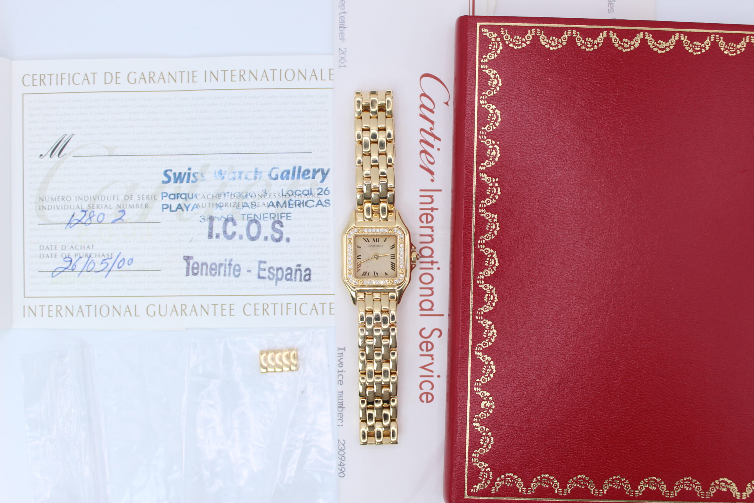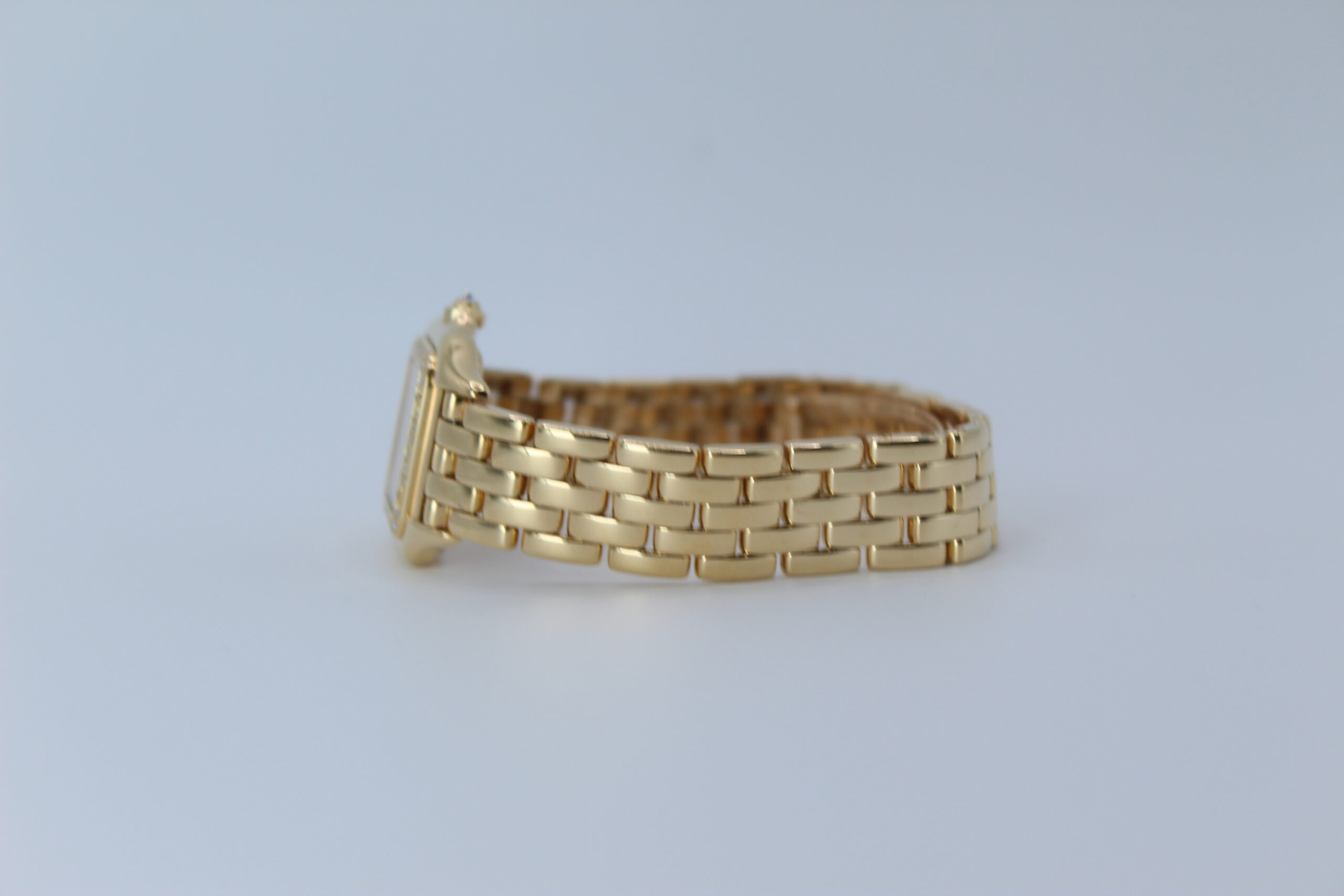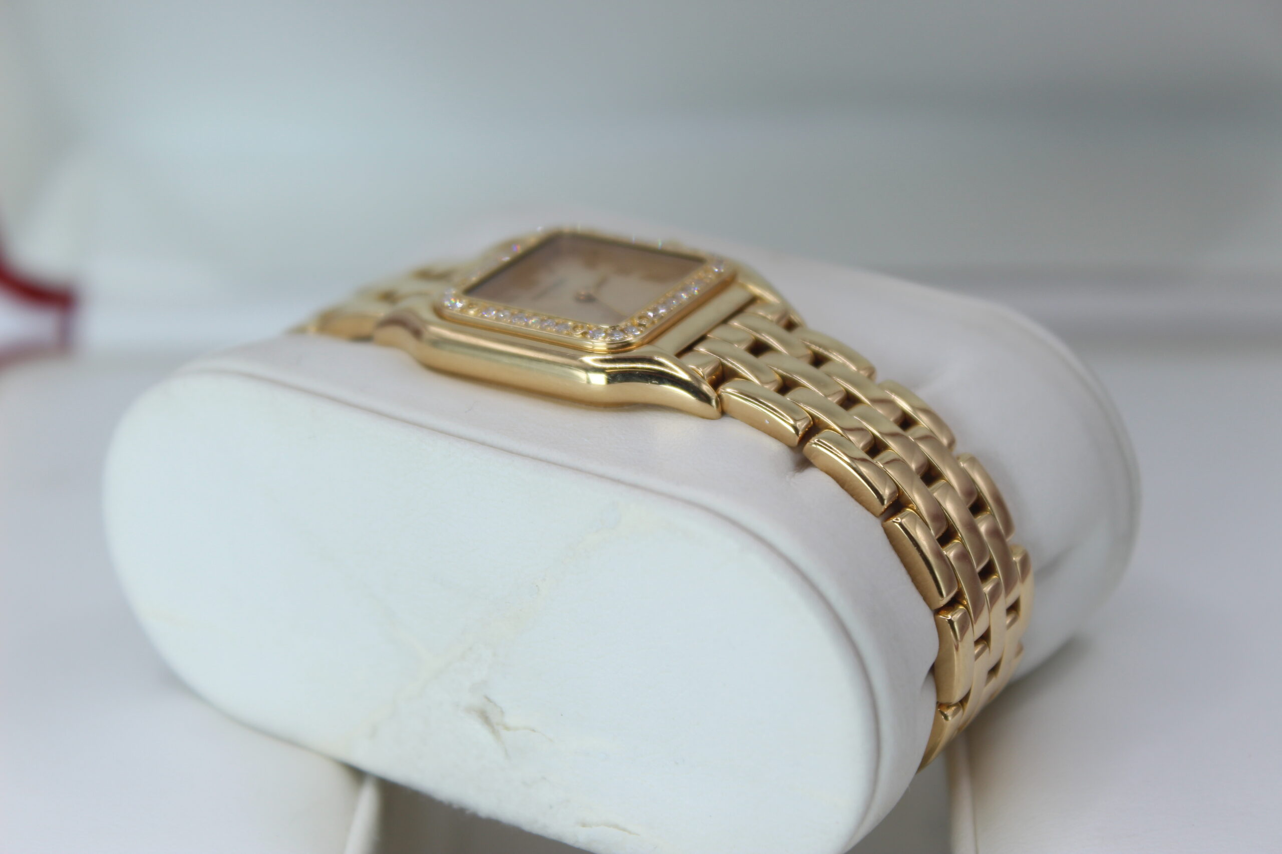 The Cartier Panthère 1280 is a timeless expression of elegance, combining the refinement of fine jewellery with the practicality of a wristwatch. Produced around the year 2000, this model belongs to one of Cartier’s most iconic collections, celebrated for its distinctive square case and fluid bracelet design. The addition of a factory diamond-set bezel elevates the watch, giving it a subtle yet unmistakable brilliance that enhances its luxurious character without overpowering its classic aesthetic.