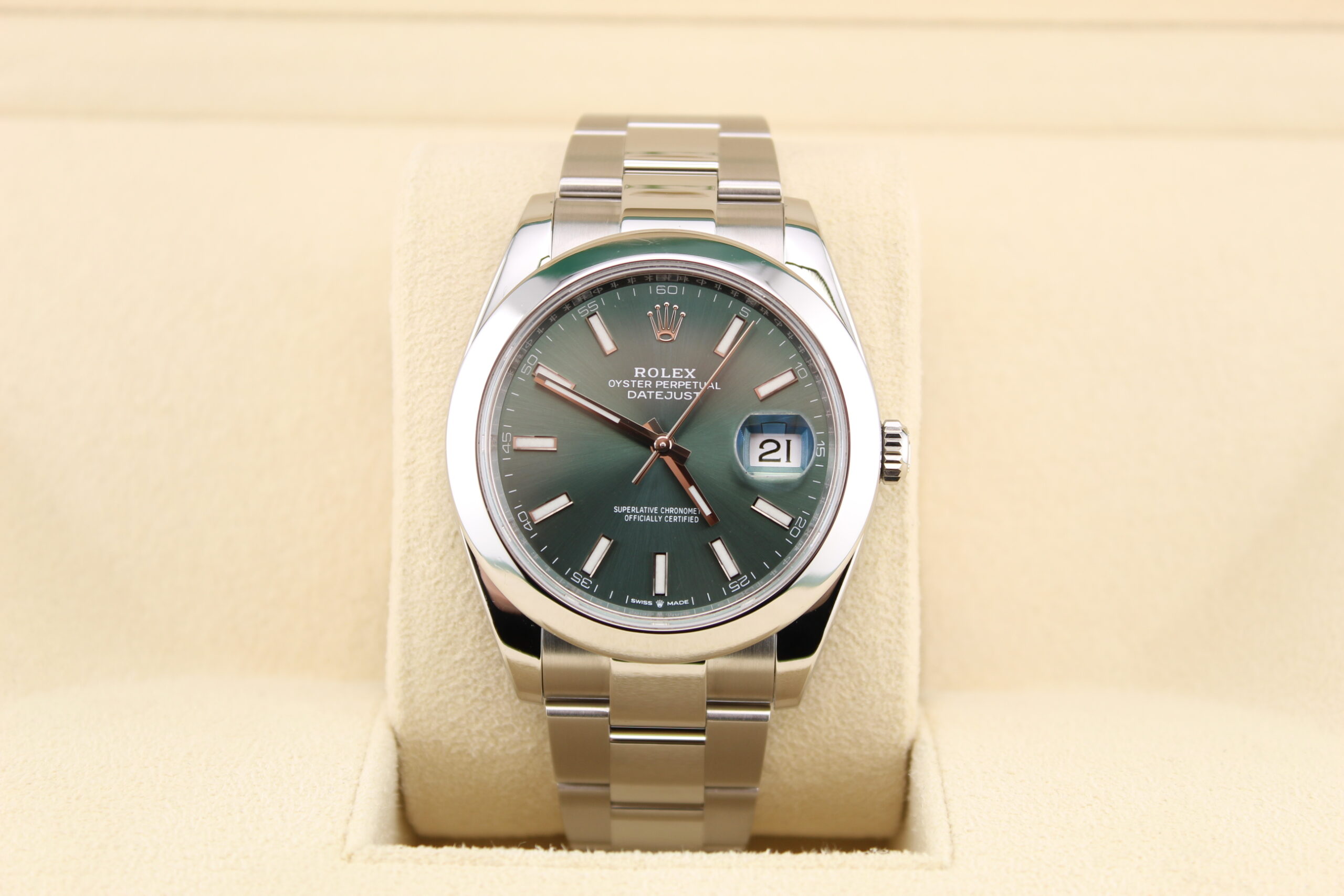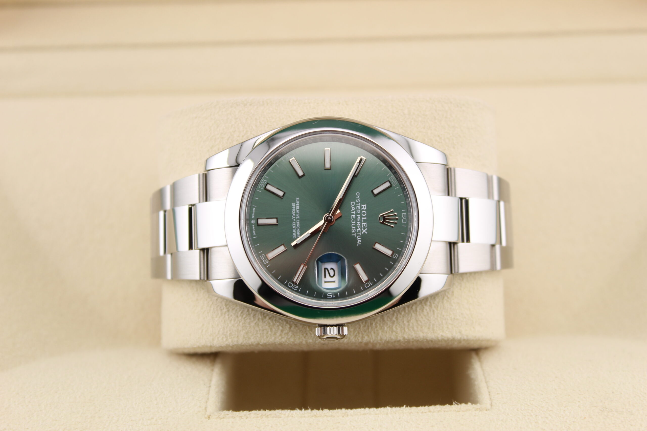 The Rolex Datejust 41 reference 126300 with a striking green dial is a vibrant take on an enduring classic. Its bold green dial offers exceptional visual appeal while maintaining Rolex’s signature elegance and legibility. Housed in a 41mm Oystersteel case with a smooth stainless steel bezel, this Datejust delivers a sleek and modern aesthetic that transitions effortlessly from casual to formal settings. Powered by Rolex’s reliable automatic movement, it boasts precise timekeeping and a robust 100m water resistance. This model is a standout choice for enthusiasts seeking a fresh, contemporary look without compromising the timeless sophistication that the Datejust collection is known for.