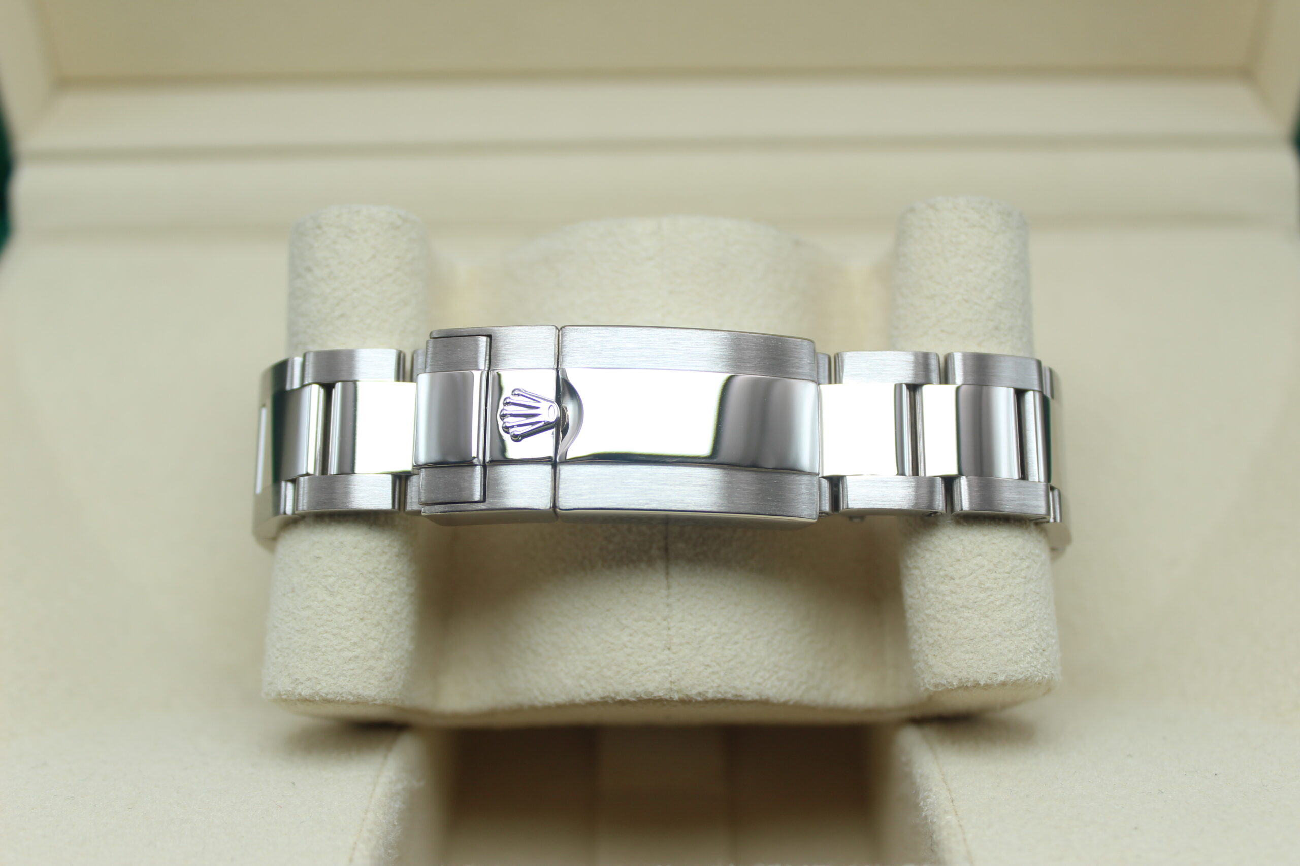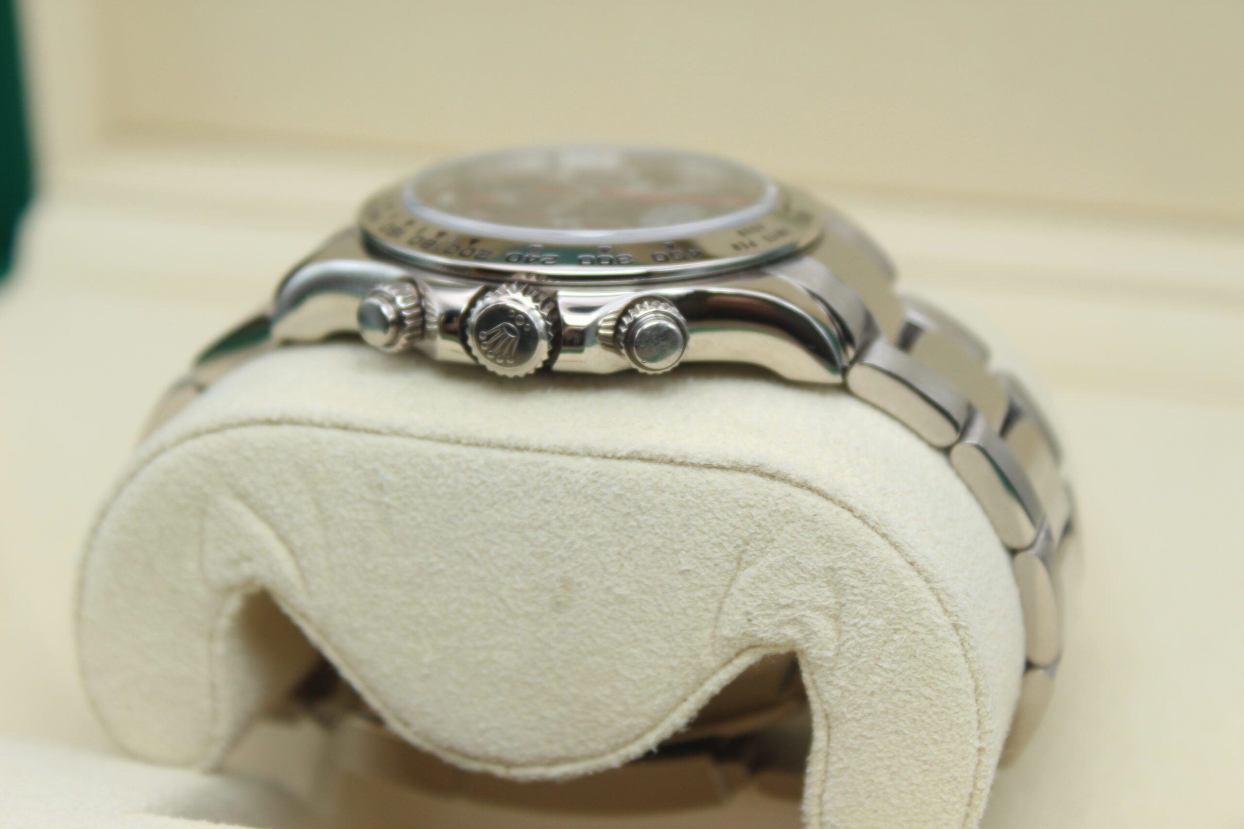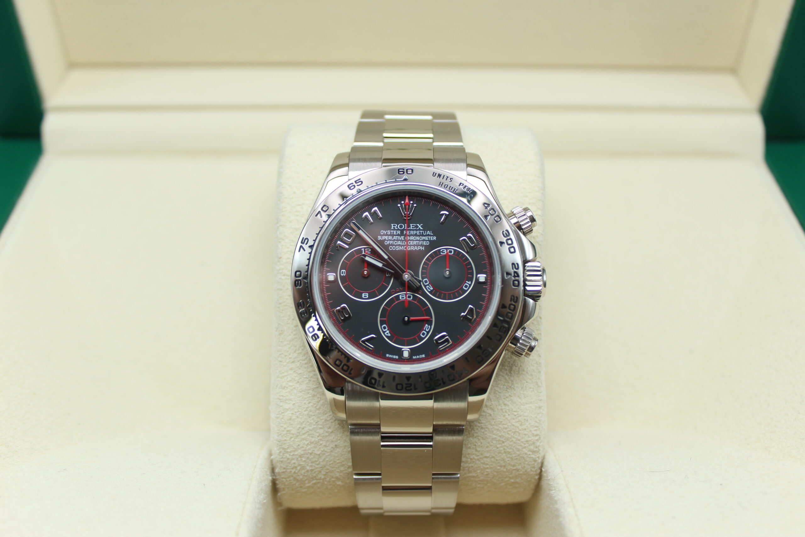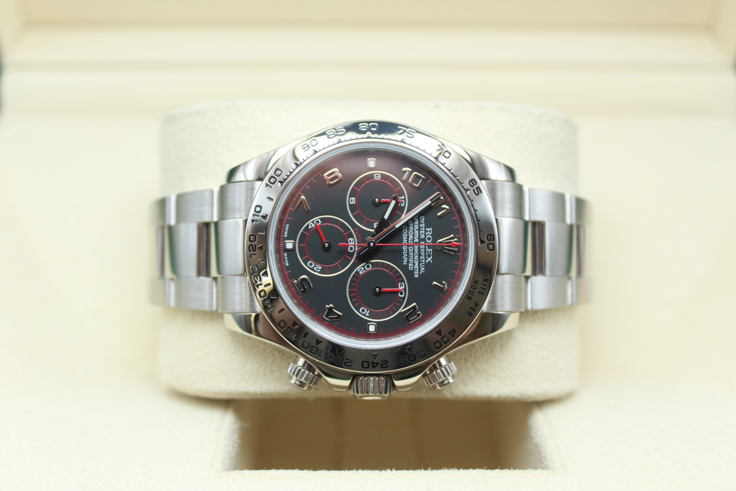 What really defines the Racing dial is the use of applied Arabic numerals instead of the standard baton hour markers. These numerals are bold, filled with lume, and give the watch a sportier, more legible appearance, as if it’s meant to be read quickly at speed. Around them, you’ll notice subtle but important red accents, including a red chronograph seconds hand and touches of red within the sub-dials or the “Daytona” text. These details are a direct nod to racing timers, adding a sense of motion and urgency to the design.